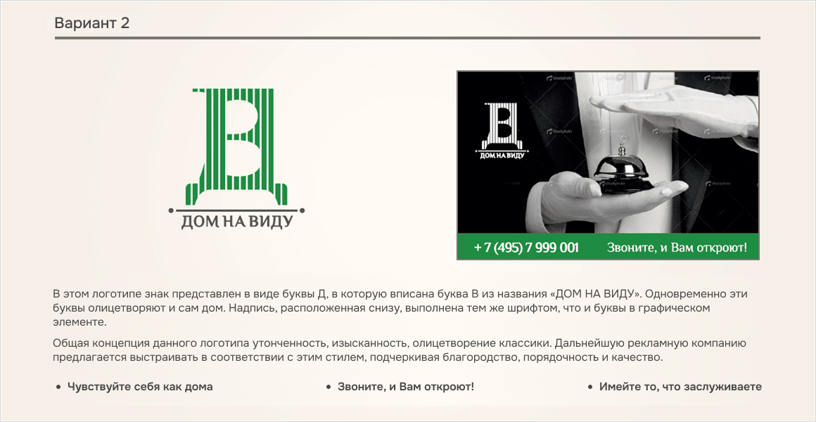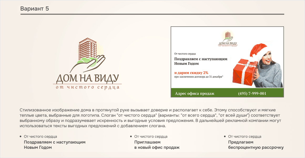 Стилизованное изображение дома в протянутой руке вызывает доверие и располагает к себе. Этому спосоюствуют и мягкие теплые цвета, выбранные для логотипа.